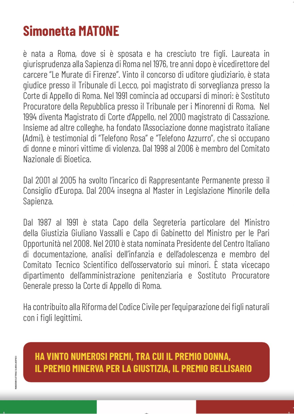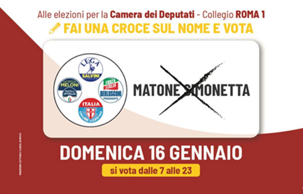 Scrivo queste righe per informarti (pochissimi ne sono a conoscenza) che domenica 16 gennaio si Voterà per la Camera dei Deputati (collegio centro storico), il Centrodestra unito ha candidato il magistrato Simonetta Matone.